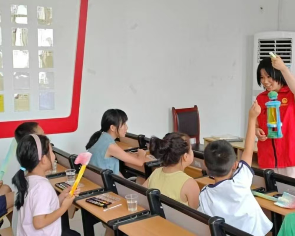 圖為實(shí)踐團(tuán)成員為社區(qū)孩子們講解農(nóng)業(yè)工具模型。王鑫淼 供圖