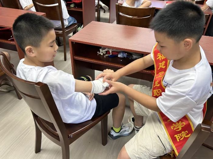圖為“榮藥”實踐隊隊員正在向小朋友示范關節(jié)包扎、繃帶螺旋包扎等實用技巧。 周嘉琪供圖