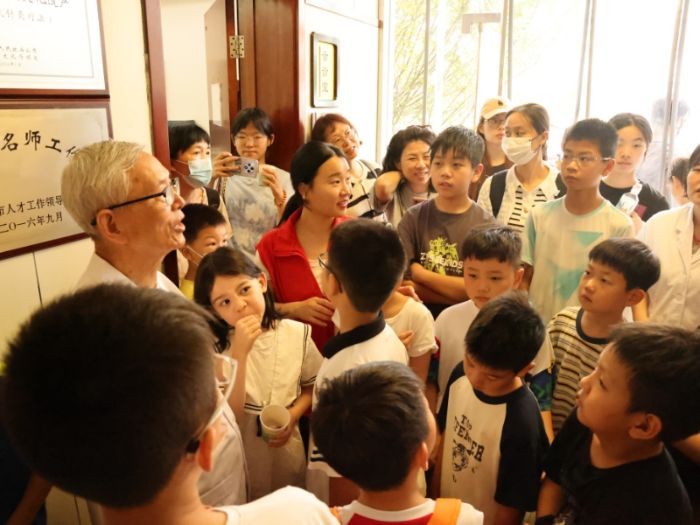 活動的高潮,是江蘇省名中醫(yī)、江蘇省非物質(zhì)文化遺產(chǎn)朱氏針法繼承人、全國老中醫(yī)藥專家學術經(jīng)驗指導老師——朱新太介紹朱氏針法。孩子們圍在他身旁,目光緊緊追隨著老先生。那一刻,“朱氏針法” 不再是一個抽象的名詞或非遺的頭銜,它化作了一種看得見、感受得到的神奇魅力,在老先生的介紹中,訴說著跨越時光的醫(yī)道匠心。這份源自實踐的震撼,深深印在了每一個小郎中的心里。