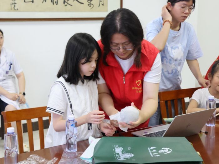 7月11日,團隊與揚州市中醫(yī)院合作舉辦"小郎中研學營"活動。15名熱愛中醫(yī)的中小學生化身“小郎中”,走進市中醫(yī)院參加了一場“本草游園會”,沉浸式感受傳統(tǒng)中醫(yī)藥文化的魅力。在這群“小郎中”中,還有兩位分別來自美國和新西蘭的小朋友Sasha和Darren。