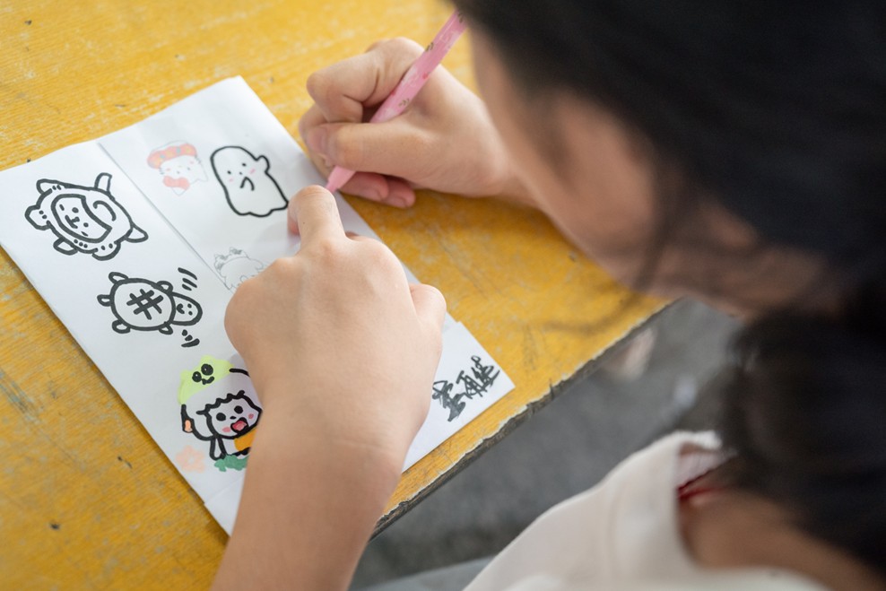 學(xué)完?duì)I舞,大家興致勃勃地投入到藏寶袋的繪畫中。每個同學(xué)領(lǐng)到潔白小布袋,拿起彩筆在上面勾勒心中美好:絢爛的花朵、憨態(tài)可掬的小動物,或是和伙伴嬉戲的場景。支教老師穿梭其間,不時指點(diǎn)夸贊。當(dāng)素凈布袋變成充滿童真的藝術(shù)品,同學(xué)們高舉作品展示,小臉上漾著自豪笑容,眼底閃爍著創(chuàng)作的喜悅。