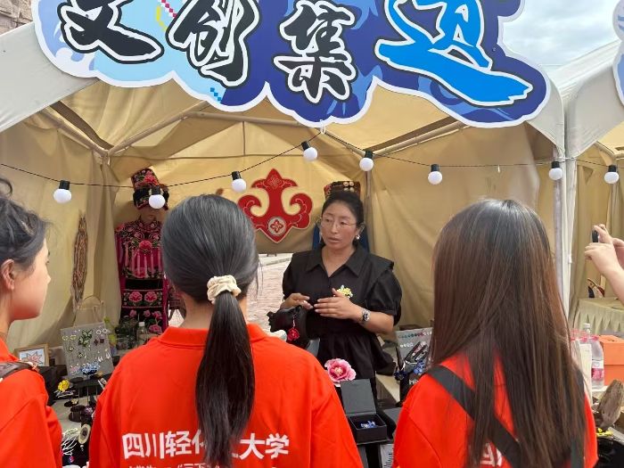 實(shí)踐首站,團(tuán)隊(duì)來(lái)到中國(guó)古羌城,沉浸式感受羌族文化的獨(dú)特魅力。在文創(chuàng)店鋪內(nèi),刺繡精美的傳統(tǒng)服飾、紋樣別致的民族飾品讓人目不暇接,店主通過(guò)一件件手工藝品,講述著羌族先民對(duì)自然的敬畏與對(duì)生活的熱愛(ài)。“我們鼓勵(lì)學(xué)生將現(xiàn)代設(shè)計(jì)理念融入傳統(tǒng)羌繡,讓老技藝跟上新潮流。”阿壩職業(yè)學(xué)院的陳老師介紹,師生共同設(shè)計(jì)的羌繡筆記本、金屬書(shū)簽等文創(chuàng)產(chǎn)品已進(jìn)入市場(chǎng)調(diào)研階段,部分還申請(qǐng)了專(zhuān)利。