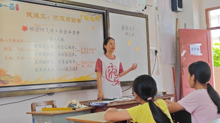 圖為主講人游君敏向?qū)W生解讀秋分古詩。通訊員 游君敏 供圖
