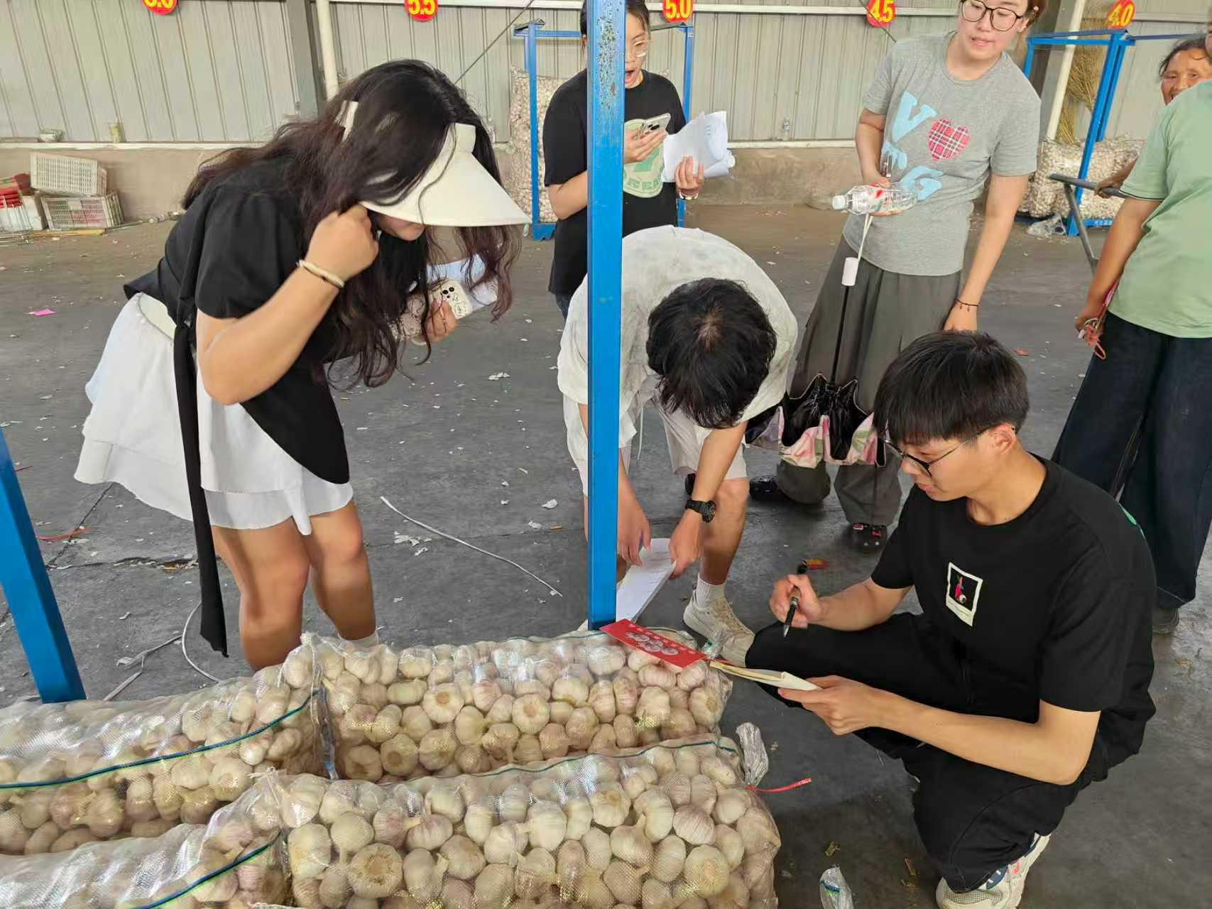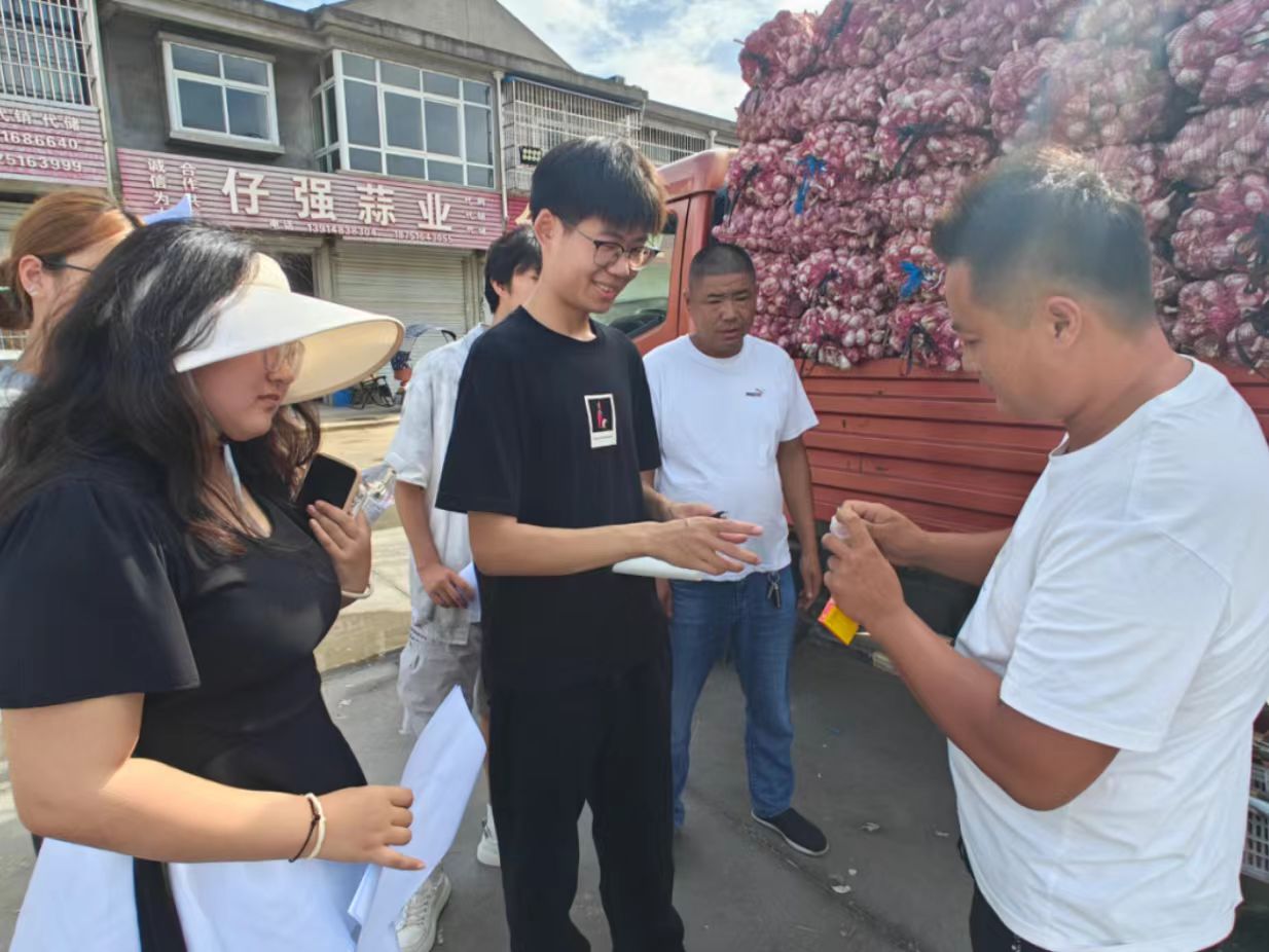 7月8日凌晨四點,天還未亮,調(diào)研組的隊員們便已出發(fā)前往碾莊鎮(zhèn)大蒜交易市場。這個時間是市場最熱鬧的時候,能最真實地了解交易情況。隊員們記錄著不同品級大蒜的收購價格,從凌晨到上午,我們觀察交易流程、與收購商攀談,詳細了解市場價格形成機制和信息傳播渠道。下午,隊員們將市場數(shù)據(jù)與農(nóng)戶反饋的銷售價格進行對比,一張清晰的“信息差分析表”逐漸成型,地理區(qū)位導(dǎo)致的市場信息滯后問題愈發(fā)凸顯。
