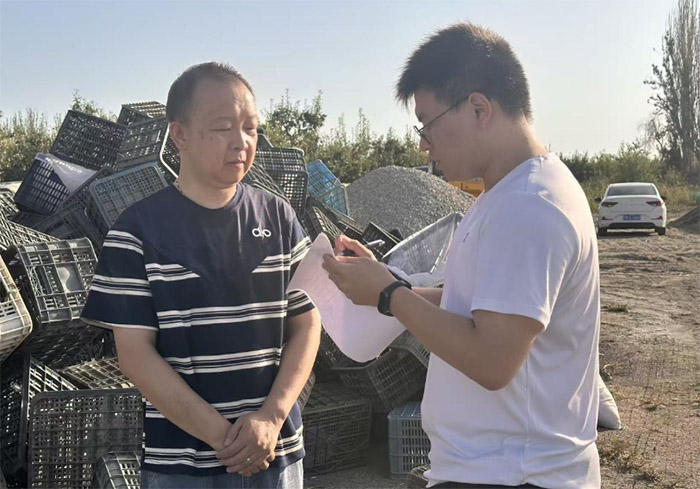 最后,團(tuán)隊(duì)來(lái)到了十一團(tuán)的梨園種植區(qū)。在當(dāng)?shù)乩相l(xiāng)的引領(lǐng)下,成員們走進(jìn)梨園,查看梨樹(shù)的生長(zhǎng)狀態(tài)以及果實(shí)的掛果情況。從老鄉(xiāng)那得知,這個(gè)梨園每畝的產(chǎn)量能穩(wěn)定保持在1至1.5噸左右,單個(gè)梨子的重量大概在80至100克之間,等梨子成熟后,售賣價(jià)格是每公斤4.5元。同時(shí),老鄉(xiāng)還介紹了梨園在灌溉節(jié)水、土壤養(yǎng)護(hù)等方面所采取的一些做法,團(tuán)隊(duì)結(jié)合自身所學(xué)的專業(yè)知識(shí),就“怎樣通過(guò)優(yōu)化灌溉讓果實(shí)的品質(zhì)和產(chǎn)量進(jìn)一步提高”這一問(wèn)題提出了初步的建議,得到了老鄉(xiāng)的認(rèn)可。