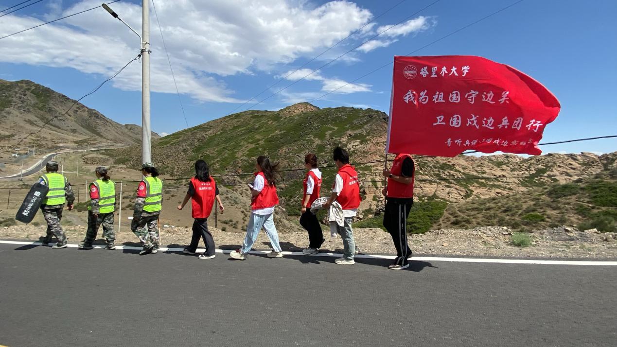 圖為實踐團成員在八十一團塔拉夏溝邊境警務(wù)站再走戍邊路 (攝/李鑫)