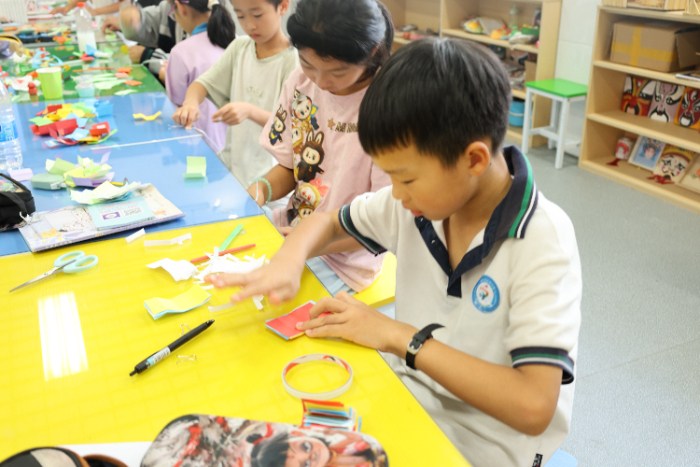 課堂上,隊(duì)員們生動(dòng)講述婺劇歷史,孩子們?cè)诜e極的互動(dòng)問(wèn)答中,對(duì)家鄉(xiāng)的這一文化瑰寶有了更深入的了解,自豪感也油然而生。隨后,孩子們拿起繽紛的彩紙,在手指間翻飛、卷曲、粘貼成一幅幅精美的婺劇衍紙畫(huà)。這不僅是一次手工實(shí)踐,更是一次沉浸式的文化體驗(yàn),讓古老的婺劇藝術(shù)以新穎有趣的方式在孩子們心中生根發(fā)芽。