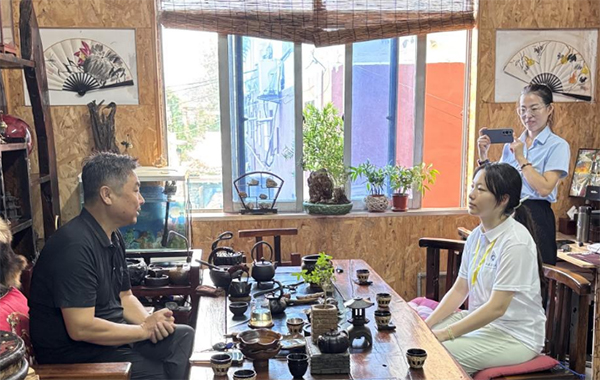 圖為團(tuán)隊(duì)成員同非遺傳承人戚平川老師交流