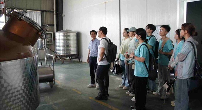 在汪百根廠長與王宇老師的帶領(lǐng)下,團隊走進懷寧藍莓科技小院,首先參觀了全自動蒸餾車間,了解"掐頭去尾"提純工藝如何精準去除甲醇等有害物質(zhì),并通過玫瑰花增香技術(shù)提升產(chǎn)品風(fēng)味,然后,陳釀方面創(chuàng)新采用橡木板材,在保證酒體風(fēng)味的同時實現(xiàn)成本控制,在藍莓干加工中,糖分添加工藝有效保持果形與口感,展現(xiàn)了食品加工的精細把控。在產(chǎn)品展示區(qū),NFC藍莓果汁的高花青素含量尤為突出。這得益于創(chuàng)新應(yīng)用的燙漂技術(shù),通過雙果膠酶協(xié)同作用大幅提升營養(yǎng)價值。汪廠長表示,將繼續(xù)深化與高校合作,重點攻關(guān)藍莓凍干破裂等技術(shù)難題,推動產(chǎn)業(yè)向高附加值方向發(fā)展。此次實踐讓隊員們切身感受到"科技小院"模式如何通過產(chǎn)學(xué)研融合,為鄉(xiāng)村振興注入創(chuàng)新動能。